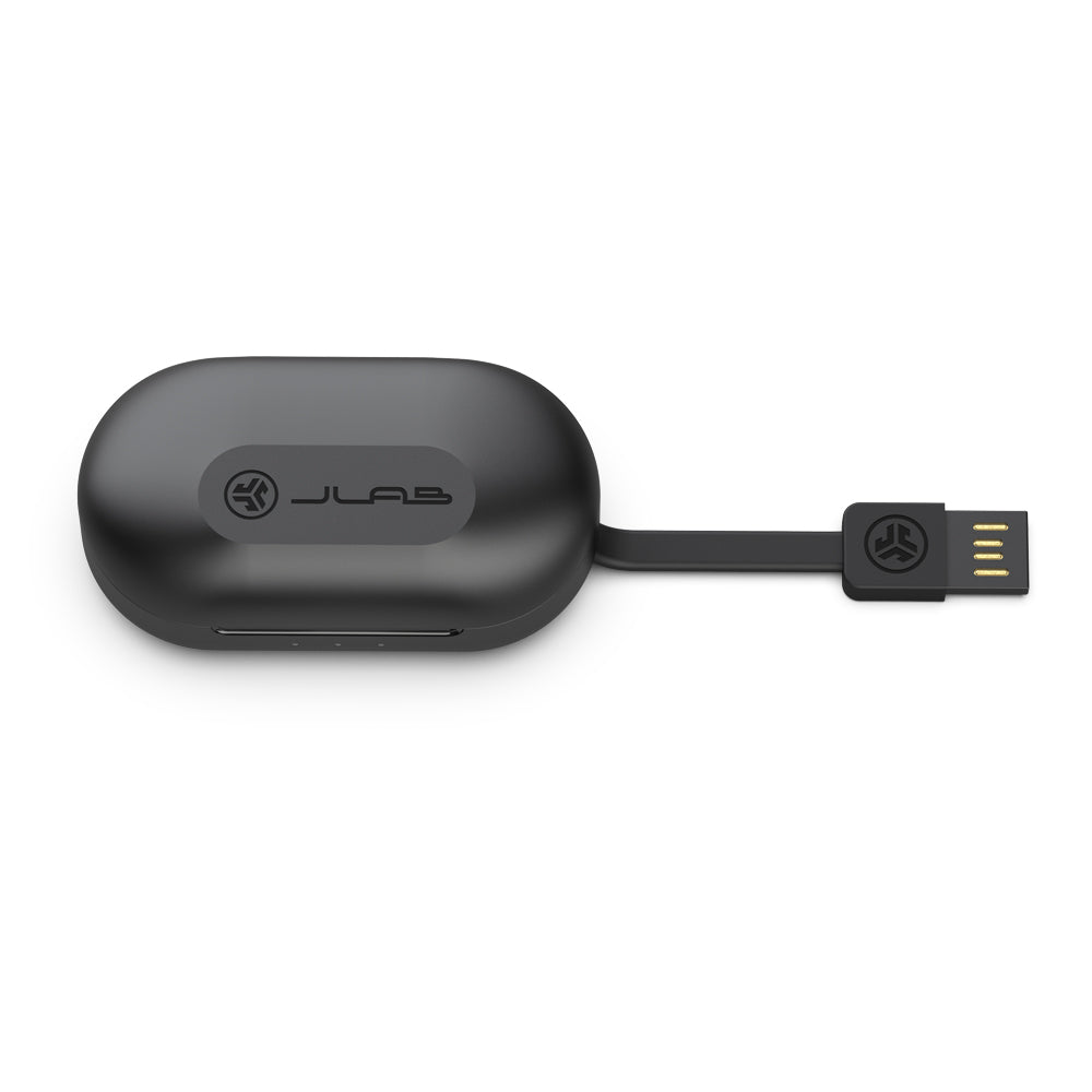 JBuds Air Pro Earbuds, Charging Case, 1 Set Cush Fins, 3 Sets of Gel Tips, and JLab 2 Year Limited Warranty.