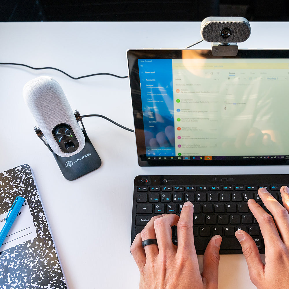 GO Talk Microphone, 5/8" Input for Swivel Mounting, 5ft USB-A to 90-Degree USB-C, and JLab 2 Year Limited Warranty.