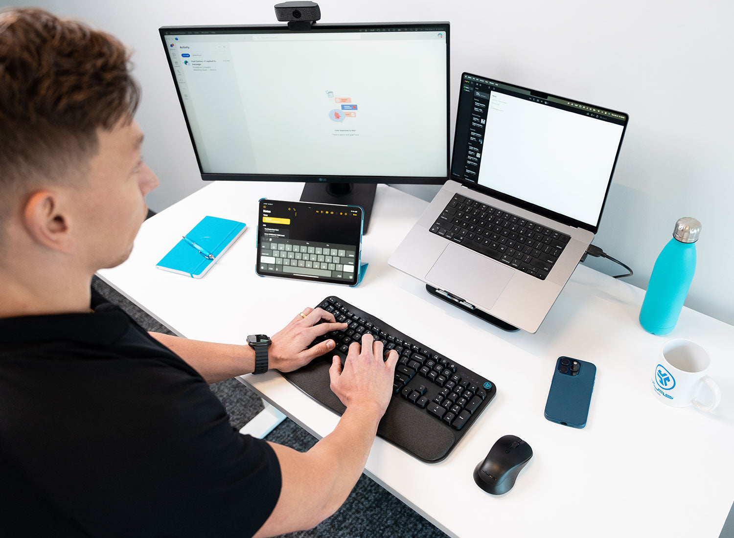 The Flow Bundle is compatible with three—count 'em, three!—device connection options. You can pair with nearly any type of device using Bluetooth 5.2 or the USB-C dongle. We hate pairing confusion too, so we made it super easy for you to switch between saved devices. To keep connections simple, both the Flow Keyboard and Flow Mouse can connect to a single USB-C dongle, freeing up other ports.