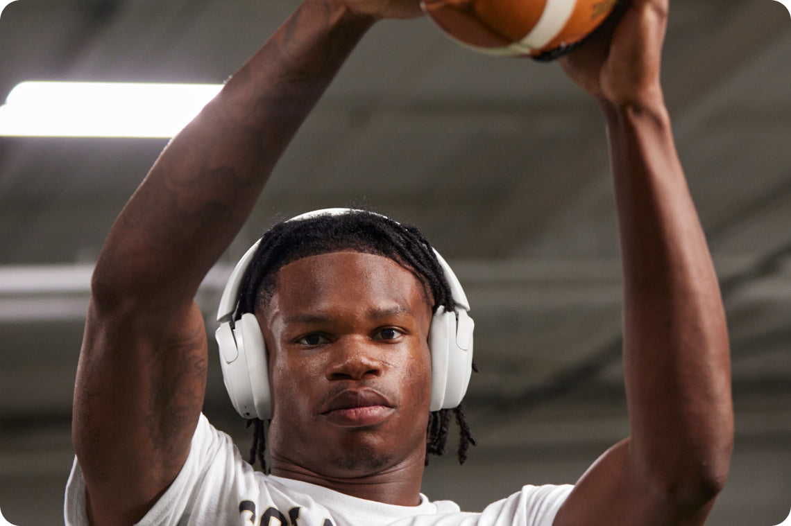 Wear the Iconic JBuds Lux designed in collaboration with Heisman finalist Travis Hunter. Distinctly his, with the addition of metallic gold-colored accents covering the ear cup swivel hinge and adorning the headband elevating the Cloud White color of the Lux. JLab’sJcon gets the gold accent treatment as well to elevate the subtle yet iconic design. Completing the look is Travis Hunters signature TH logo on both ear cups, making this Travis Hunter custom a winning combination.