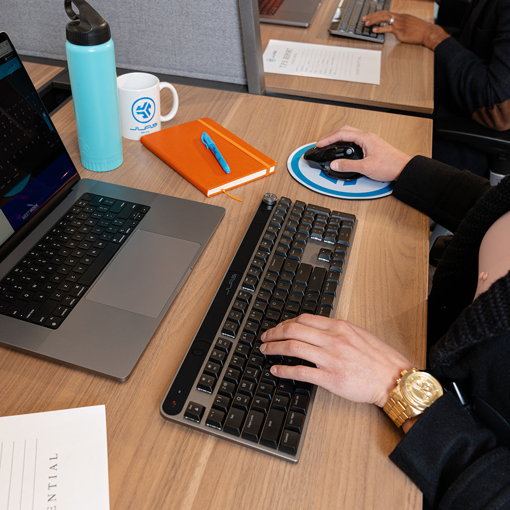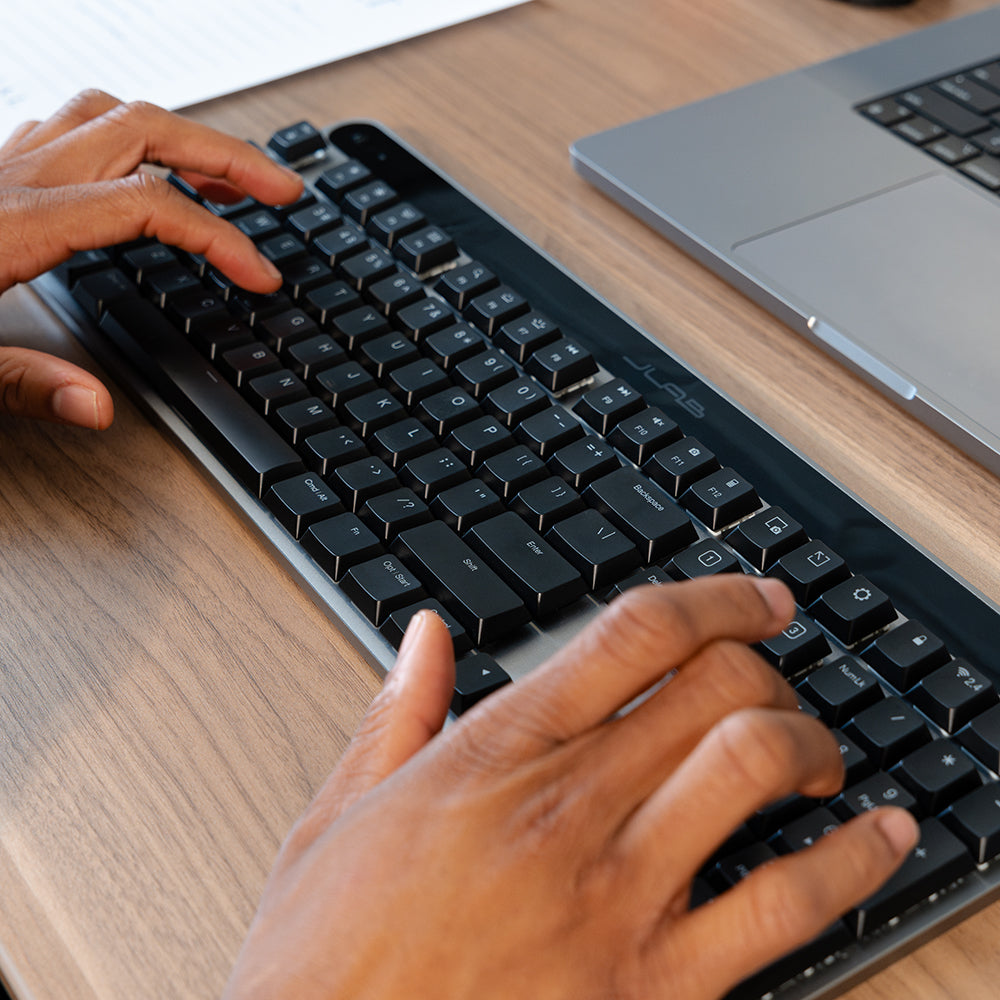 Advanced low-profile wireless mechanical keyboard with quiet mechanical switches, illuminated backlight, and a rechargeable battery lasting 1+ year. Seamlessly switch between 3 devices via Bluetooth or USB. Compatible with Windows, Mac, iOS, Android, and Chrome OS.