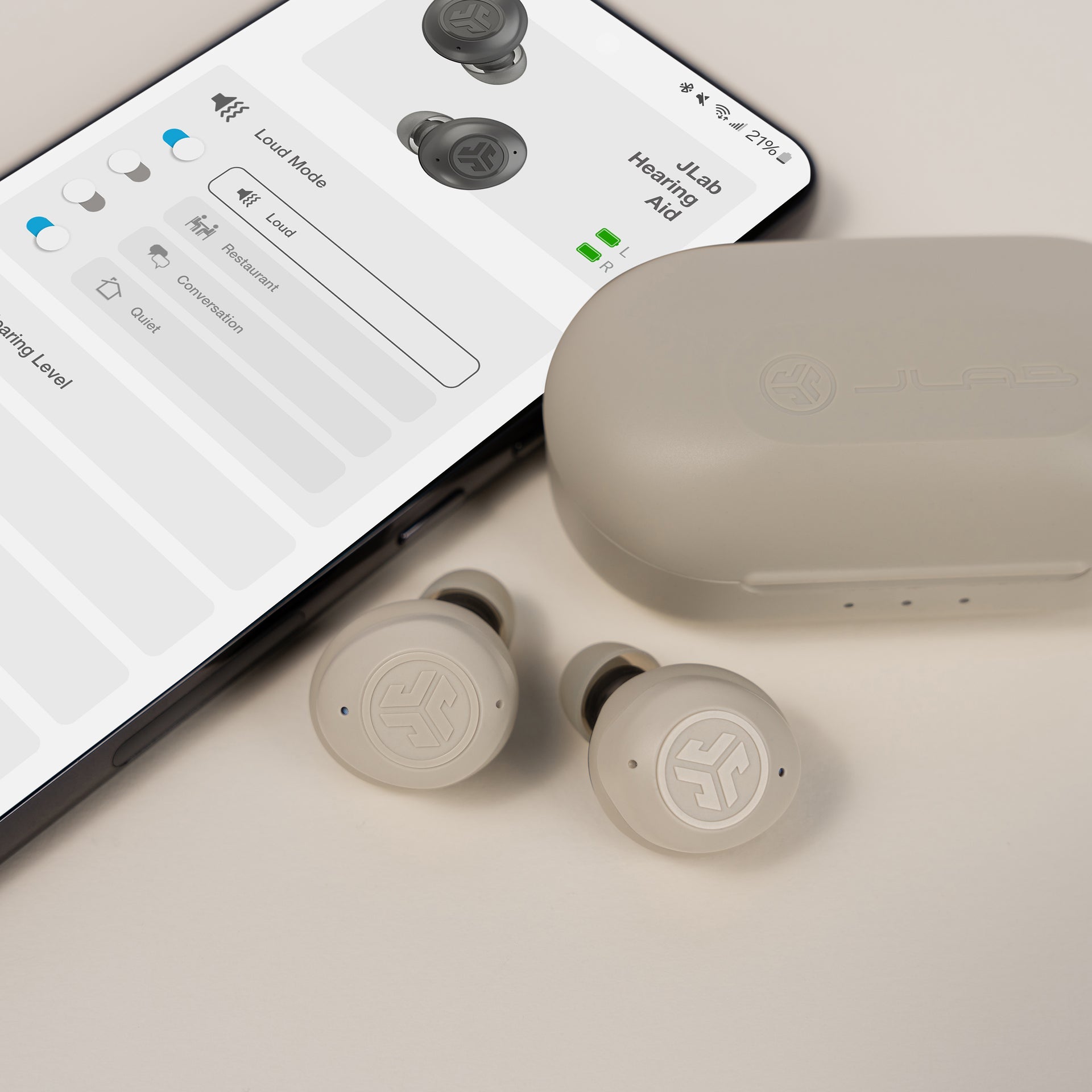 Hey. We know hearing loss isn’t fun. And wearing something that looks like a hearing aid, isn’t fun either.Introducing the Hear OTC Hearing Aid & Earbuds, a sleek 2-in-1 solution merging hearing aid technology with Bluetooth connectivity for music and calls. Seamlessly transition between hearing aid mode to enhance your hearing and earbud mode to enjoy your favorite tunes. From quiet moments at home to conversations with friends, to dining in restaurants and navigating bustling streets, JLab’s four preset hearing modes help you amplify the sounds around you.